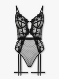 Zatrać się w urokach naszego body Natalia, zaprojektowanego, aby oczarować przezroczystą siateczką ozdobioną zabawnymi kropkami i misternym haftem kwiatowym. Z dekoracyjnymi wycięciami, Natalia jest ucieleśnieniem zmysłowej elegancji. Uzupełnij wygląd koronkowymi pończochami i promieniuj pewnością siebie.